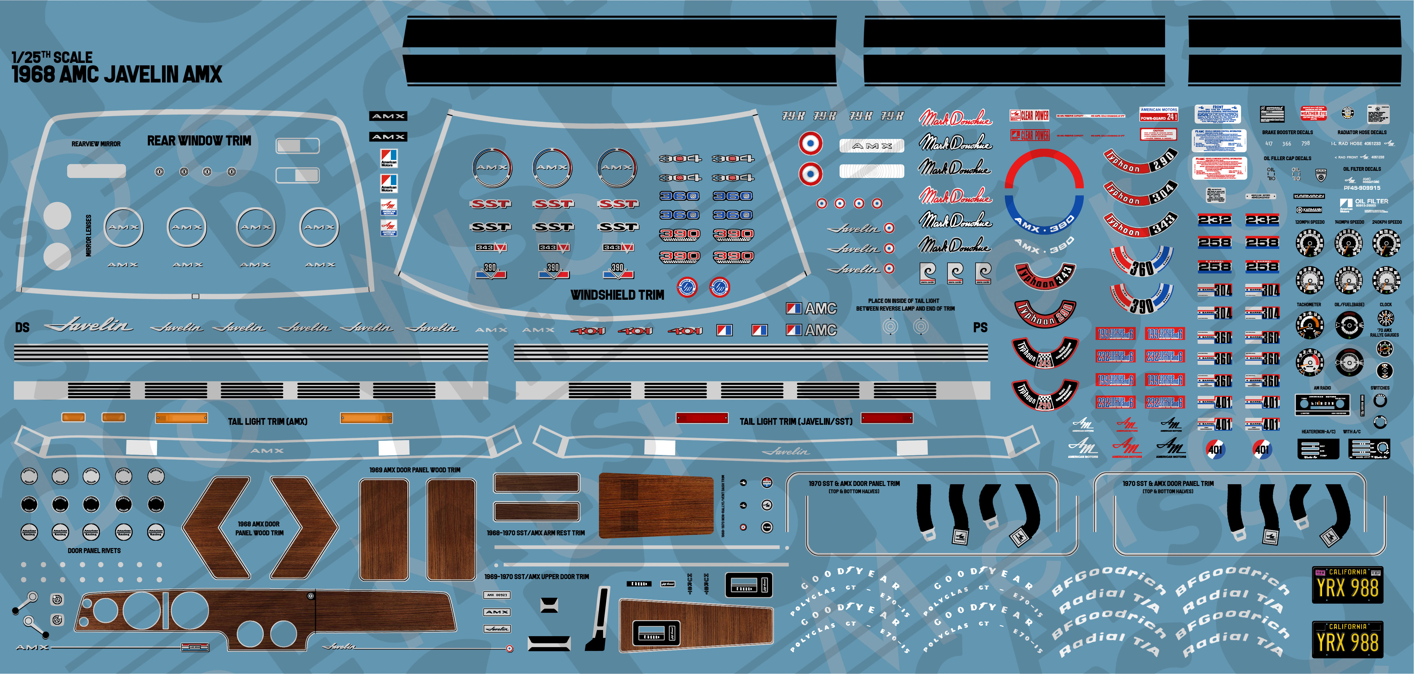 The single most complete set done for the AMC Javelin AMX for the 3D print kit available from DioLex Productions, designed by Andrey Bezrodny. The set carries every single detail one could wish from, from exterior trim and every type of emblem imaginable(including 79-K Karmann emblems), through exhaustive underhood decals for every engine type and every single piece of trim, every gauge, you name it, for the 1968, 1969 and 1970 model years.