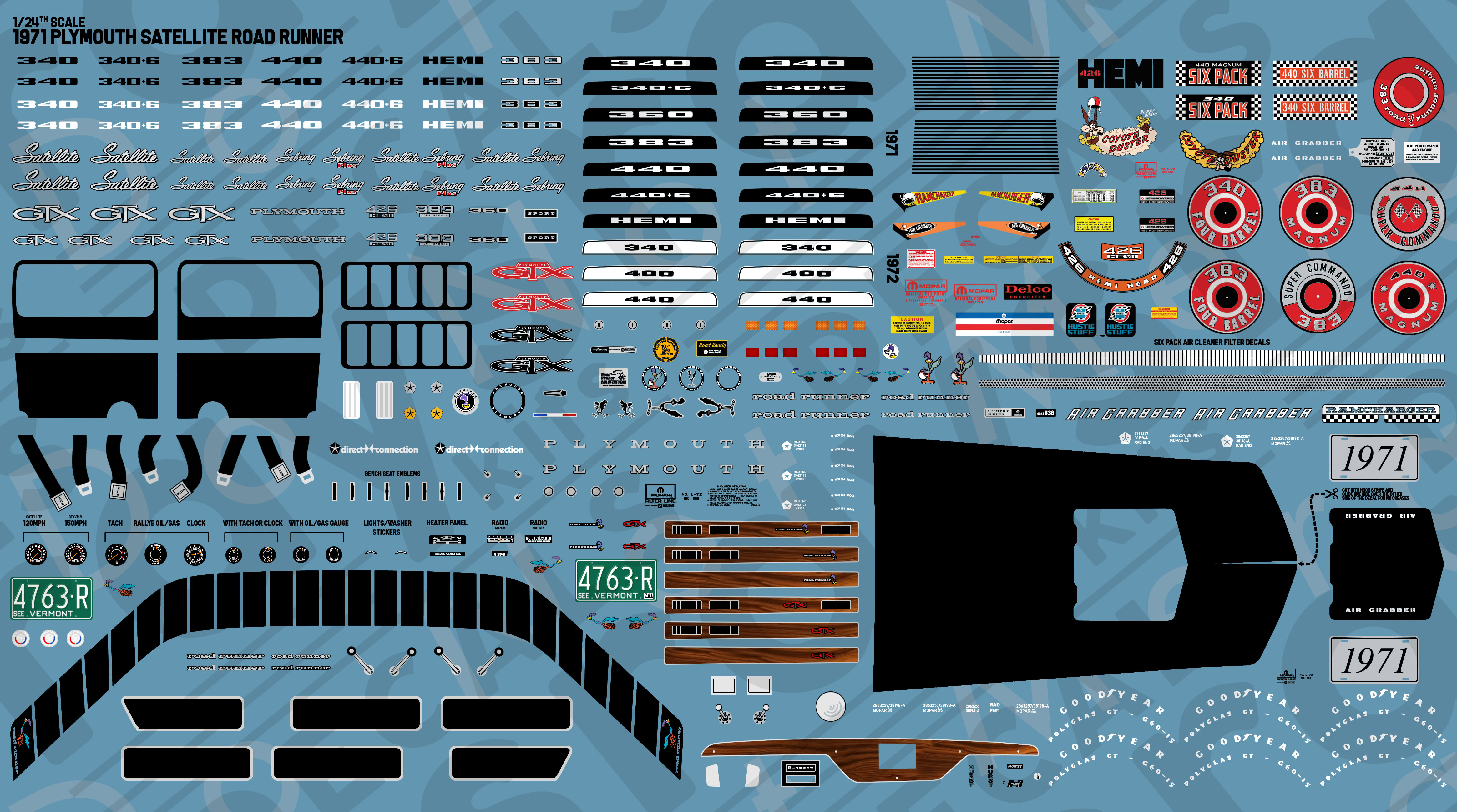 All encompassing set designed for the Monogram and Revell 1/24th scale Plymouth Satellite GTX kits. Only made for the aforementioned 1/24th scale kit, the set contains quite literally all that one would need to fully detail out a proper replica of the ’71 Road Runner. It has all the emblems, including the Satellite and Satellite Sebring emblems, fender emblems, rear quarter emblems, hood engine size emblems and the fender engine size call outs, GTX and Roadrunner call-outs for the trunk and the iconic rear fascia blackouts including tail light masks. For the interior it carries all the Road Runner segment trim, center console, every available rallye gauge, full dashboard detail, door panel detail and shifter detail. On the underhood part all air cleaner details are there, including the six pack filters, hose decals and lots more. Exterior decals include the Road Runner over-roof strobe stripe, the air grabber hood decal, and the strobe striping for the Satellite/non-grabber hoods.