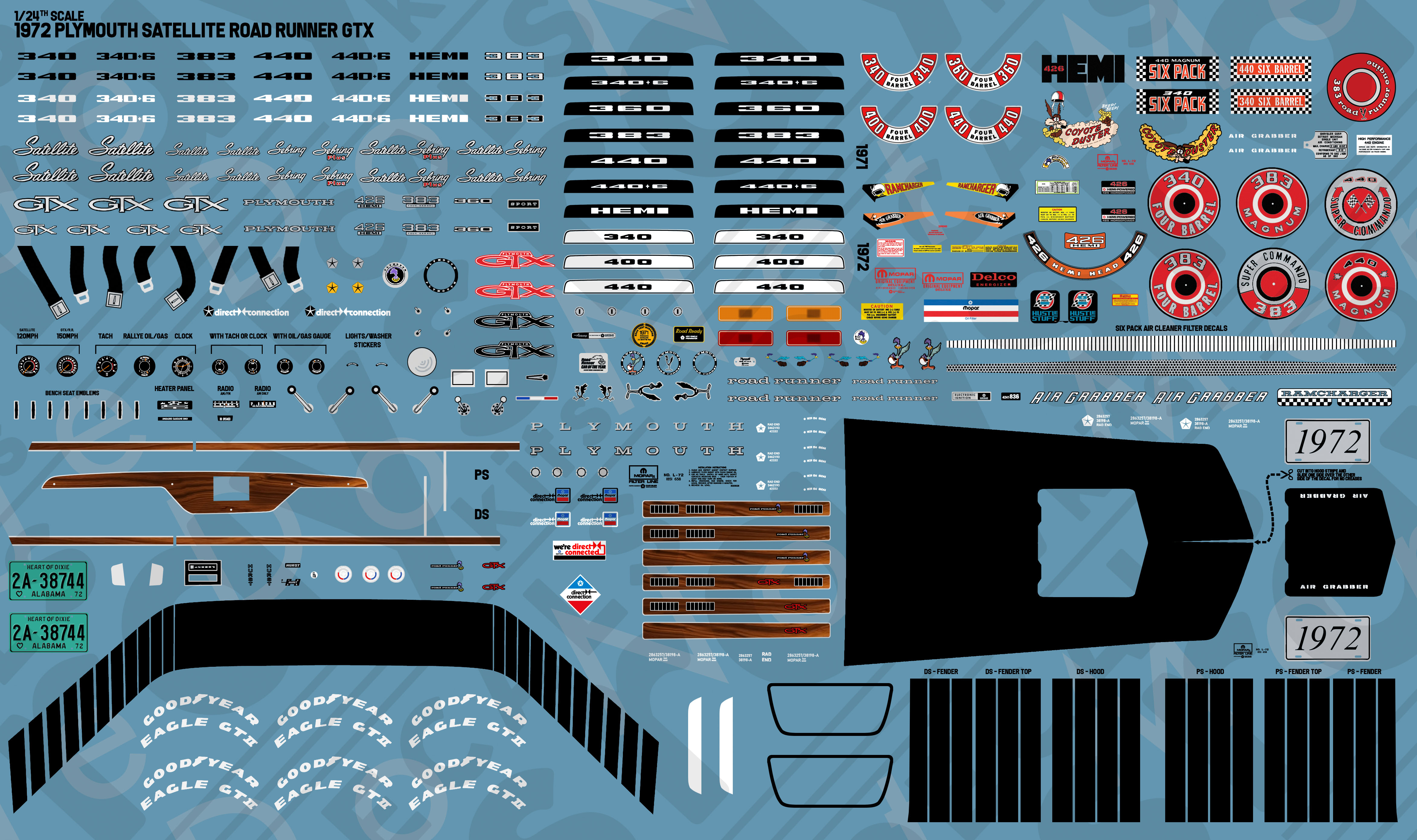 All encompassing set designed for the Monogram and Revell 1/24th scale Plymouth Satellite GTX kits. Only made for the aforementioned 1/24th scale kit, the set contains quite literally all that one would need to fully detail out a proper replica of the ’72 Road Runner GTX. It has all the emblems, including the Satellite and Satellite Sebring emblems, fender emblems, rear quarter emblems, hood engine size emblems and the fender engine size call outs and GTX and Roadrunner call-outs for the trunk. For the interior it carries all the Road Runner segment trim, center console, every available rallye gauge, full dashboard detail, door panel detail and shifter detail. On the underhood part all air cleaner details are there, including the six pack filters, hose decals and lots more. Exterior decals include the Road Runner over-roof strobe stripe, the air grabber hood decal, and the strobe striping for the Satellite/non-grabber hoods.