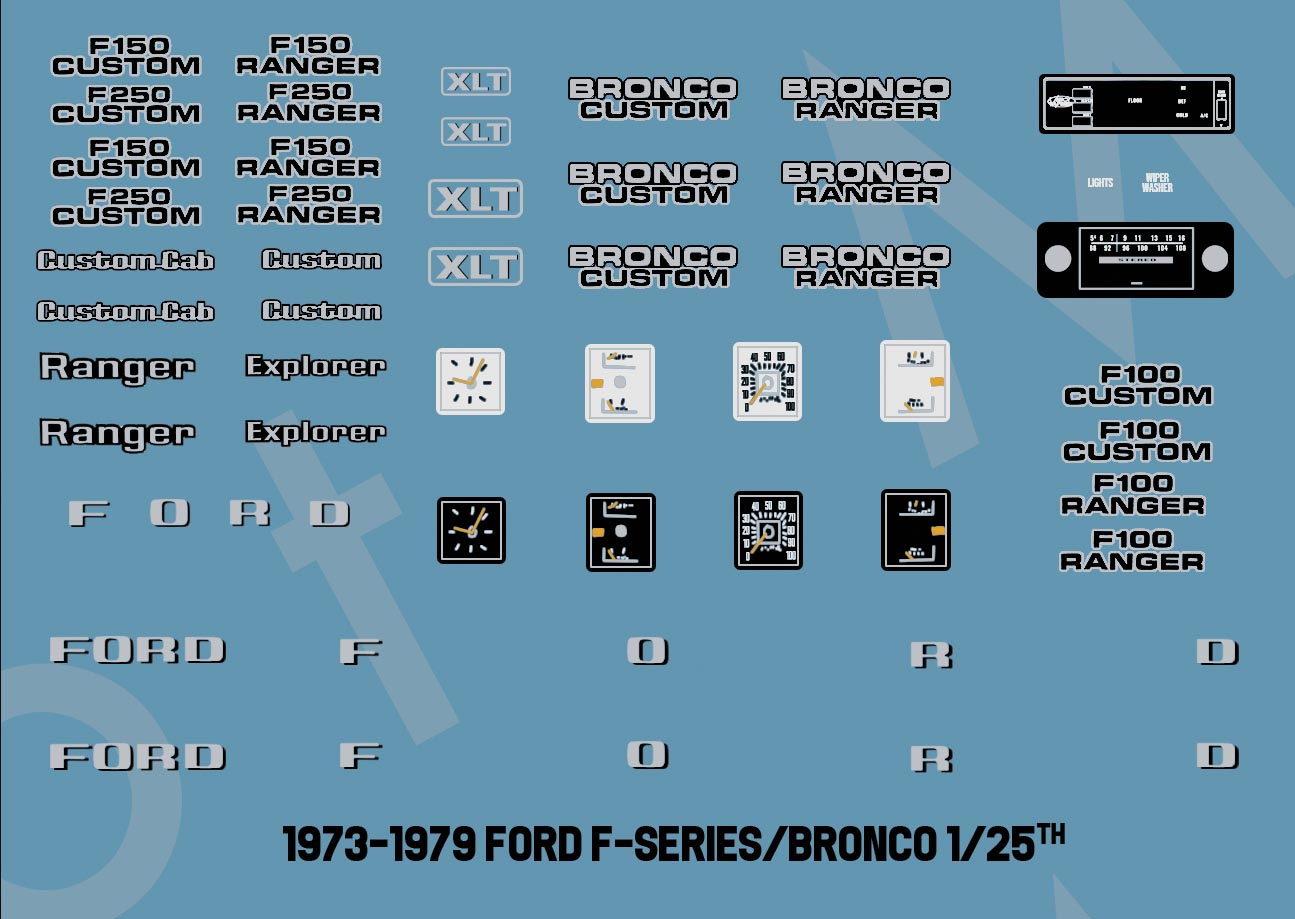 A set of emblems printed with reflective silver and gold textures that will make your emblems truly pop. Covers enough emblems to have every single type of 1973-1979 Ford pick-up and Bronco covered in 1/25th scale. Also includes two types of dashboard gauges, instrument clusters, XLT emblems and Ford emblems.