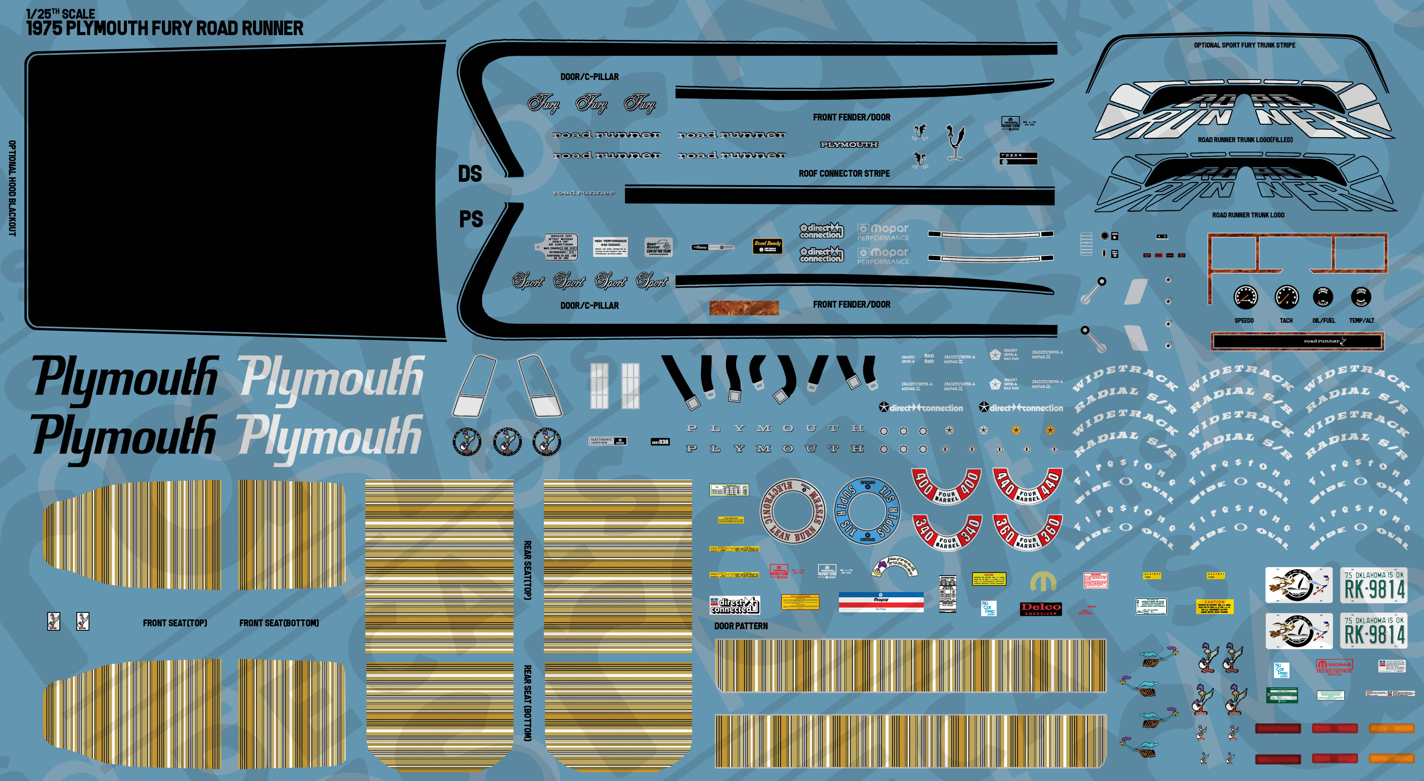 Very large set for the MPC Plymouth Fury Roadrunner from 1975 and the erroneously numbered 1976 kits in 1/25th scale. It contains everything to kit out a whole perfect replica, from all the stripes including optional Fury striping and the hood blackout to two versions of the iconic Road Runner tunnel graphic. Other assorted details include tail light trim, indicator trim, every type of emblem found on a 1975 Fury and Road Runner. The interior gets just as much love, from all the fabric patterns to wood trim, seatbelt decals and even more. The underhood gains every bit as much attention with every sticker, decal and plate accurately replicated.