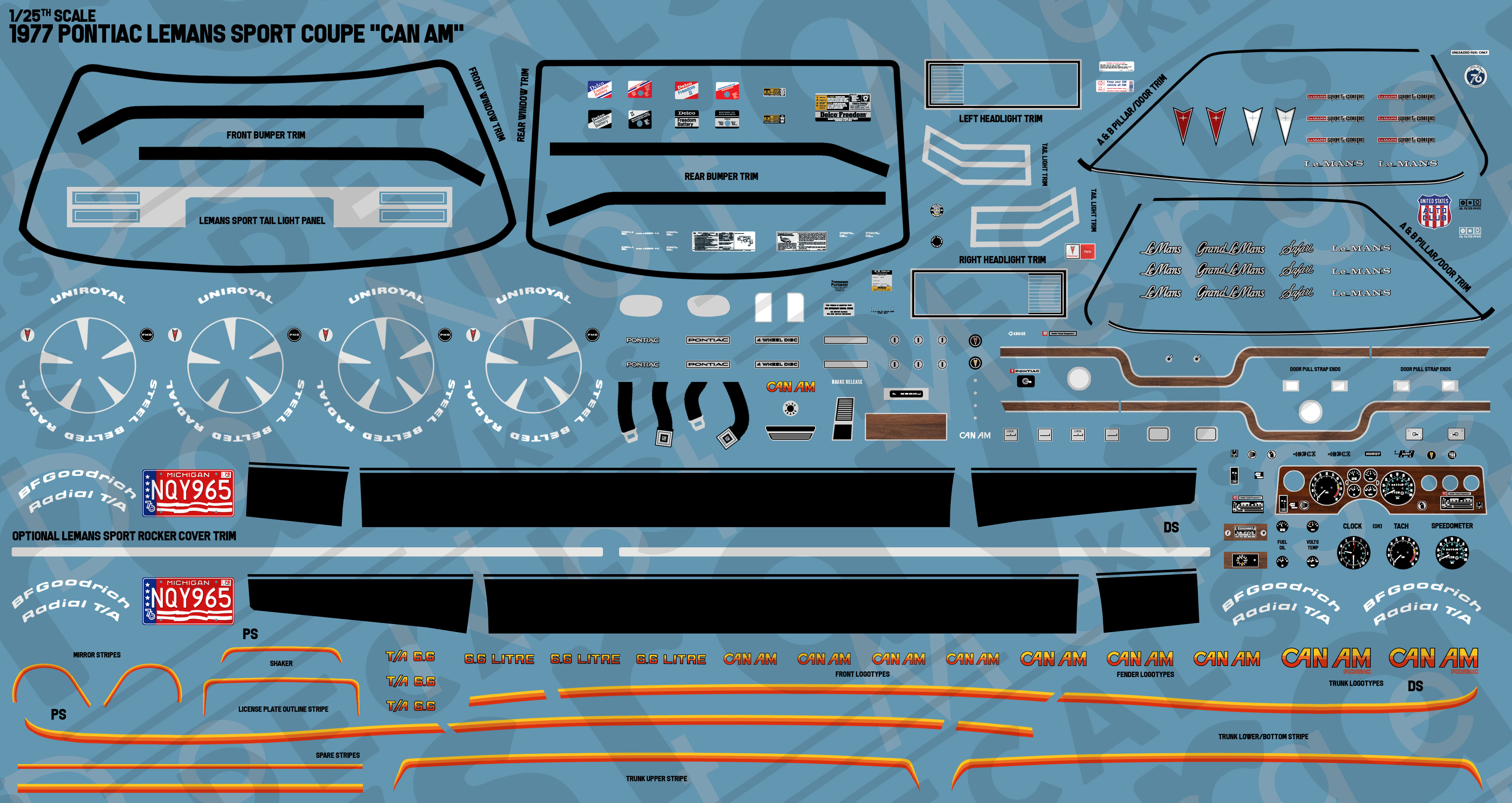 Designed for the Andrey Bezrodny 1/25th scale ’77 Pontiac Lemans Can Am 3D printed kit(available from DiOlex Productions build ready). The set contains quite literally everything and more to make a fully detailed LeMans Sport Coupe with the 1977 Can Am package. It has the blacked out window trim for the front, rear and sides. It has the headlight detail, tail light detail, bumper trim, reverse lights and more for easier detailing. The set also carries every available emblem for the 1976 and 1977 LeMans models, full interior detail including rear seat seatbelts, door trim, every gauge and emblem for the dashboard and last but not least; every imaginable OEM decal for the underhood components. The Can Am decals are faithfully replicated, including both T/A 6.6 and 6.6 LITRE call outs.