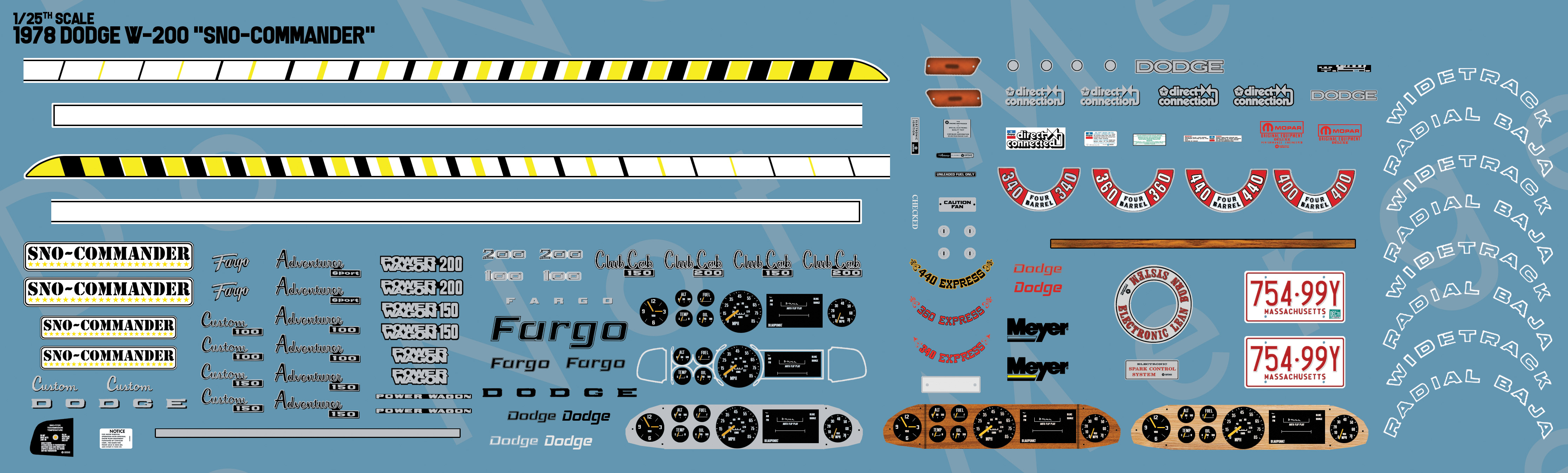 Designed for the MPC 1973-1980 Dodge D-series Pick-Up, Dodge Warlock & Lil’ Red kits in 1/25th scale. The ’78 Sno-Commander set includes the unique snow plow decals with the strobe effect, Sno-Commander call outs and enough emblems, dashboard types and underhood and interior detail to bring every highlight out on your model. There were several factory type of strobe stripes available, including a color inverse and body-matching colors – feel free to e-mail ray@rayskits.com or vicky@rayskits.com with your requests.