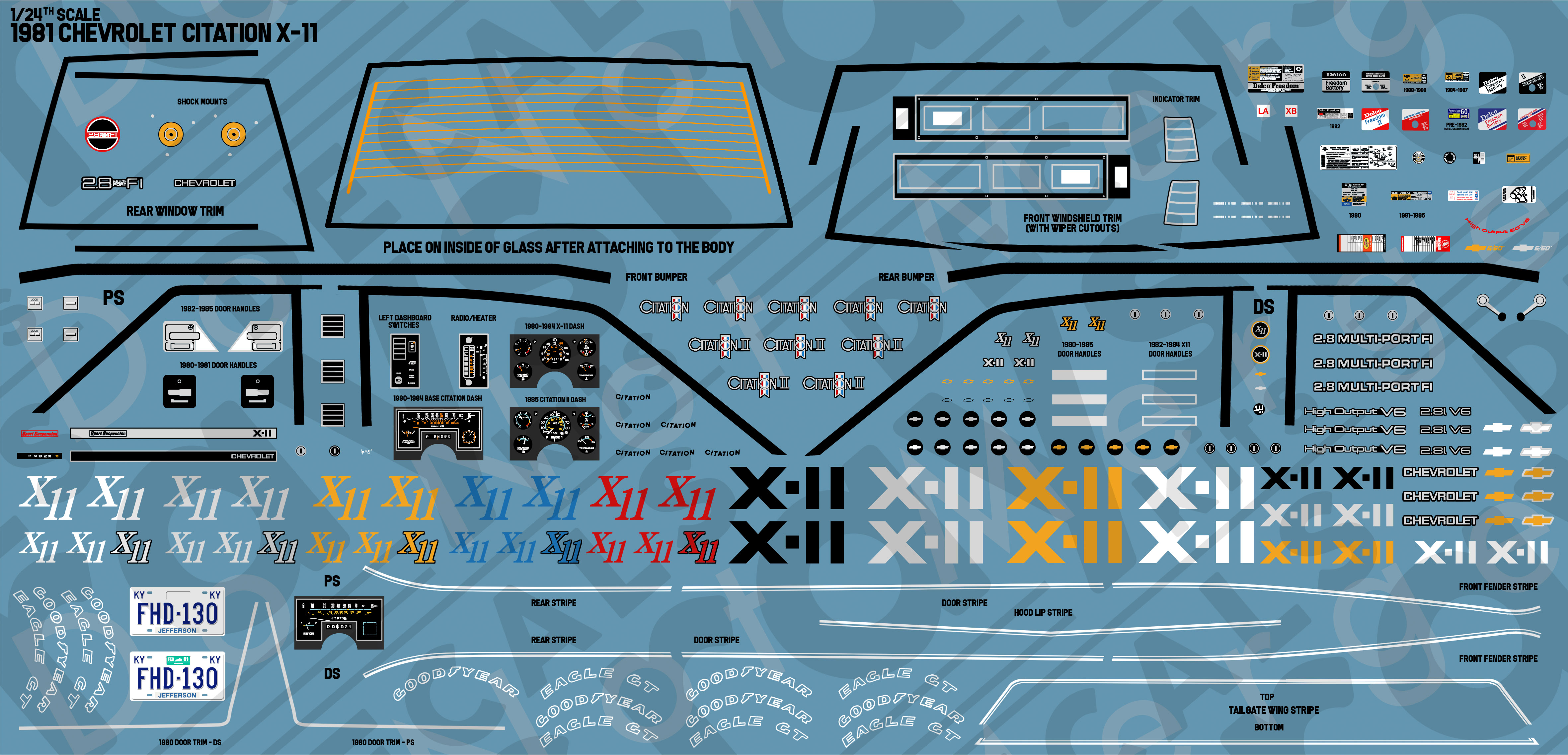 Massive set for the Revell-Monogram Citation kit to fully detail a X-11 from 1981, with every ounce of detail replicated accurately. Every trim piece is available for easier detailing, including tail light trim and indicator trim. All of the emblems, X-11 logo-types and caps are also covered, as well as the entire interior for every single year of Citation available through 1980 and 1985.