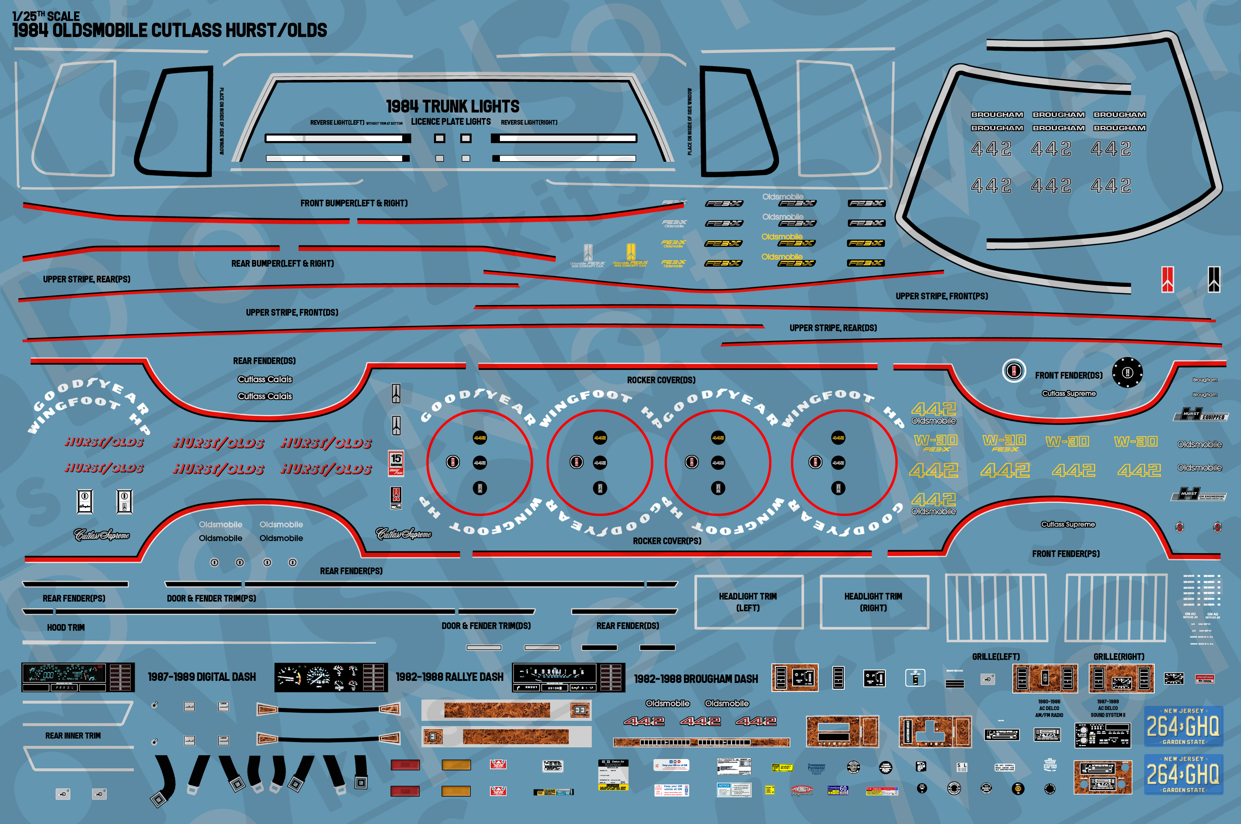 Massive and upgraded set to fully cover a proper equipped Oldsmobile Cutlass Hurst/Olds from 1984 with all the striping needed. We also have an equally detailed(and adjusted to match a proper ’83) 1983 Hurst/Olds set with the inverted colors. The set carries all the trim to make detailing easier, from the front, side and rear windows to the door trim and hood trim. For the interior the decals for all the wood grain panels with the burlwood are covered, the three possible options for gauges, every single button and face has a decal ready. All of the emblems for the era are included, as well as several of the prototype W-30 decals and all underhood details as well.