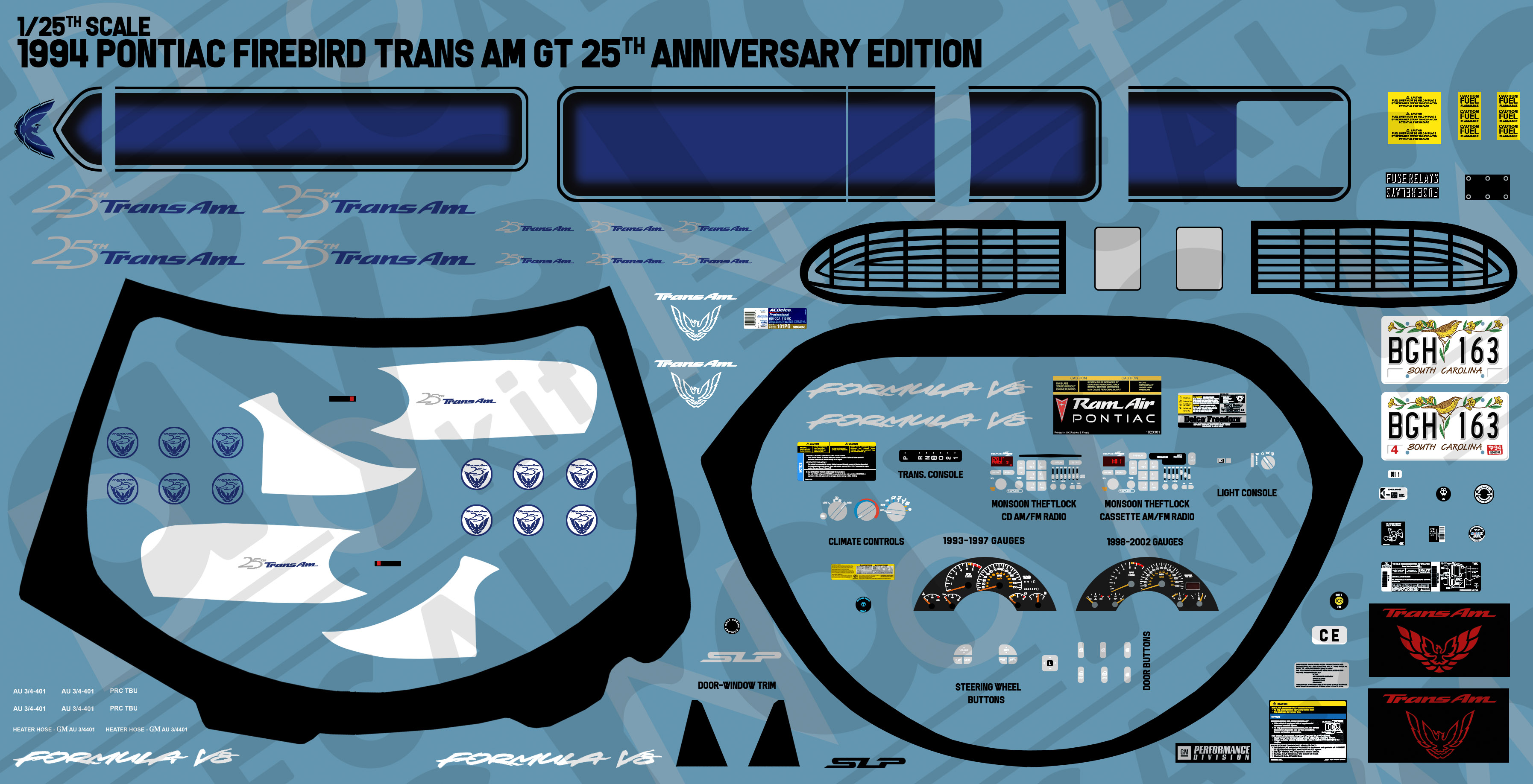 Designed for the Revell and Monogram ’93 and ’94 Firebird kits, this set has everything(and a little more) to fully deck out a replica of the one year 25th Anniversary edition from 1994. It has the shaded stripes, the door names, newly updated tail light masks, window blackouts and the entire array of interior details from door panels all the way down to every single button. Under the hood it accurately replicates the engine bay with every cap, cover and sticker detailed out for that particular year.