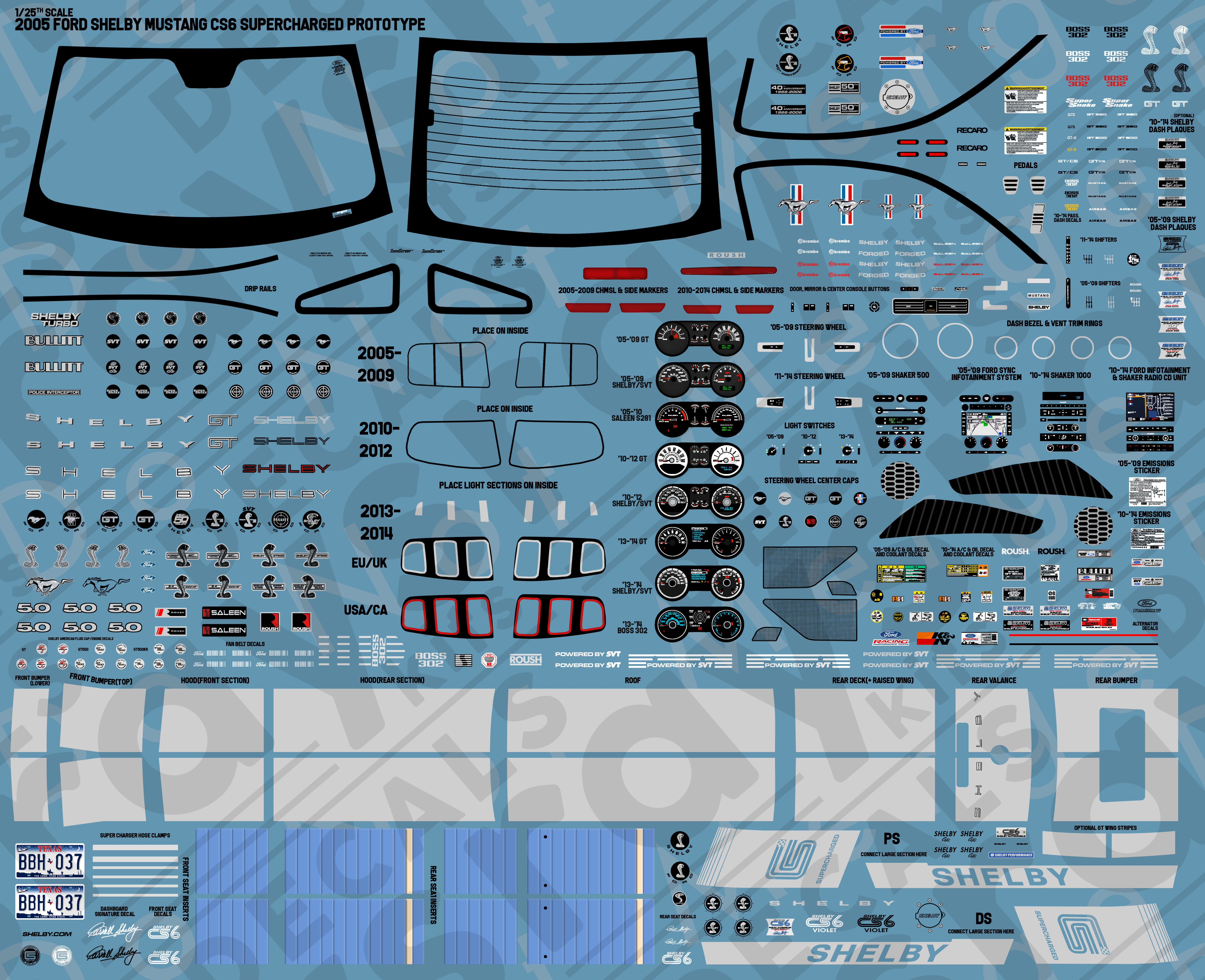 Massive set created for Revell ’05 through ’14 Mustang kits. The set carries the prototype version of Carroll Shelby’s first foray into the S197 Mustang with his CS6 supercharged “Violet” edition Mustang, with its unique hockey stripes and wider twin over-the-top stripes, the upholstery logos, seat inserts, the Shelby tuning upgrades like brakes, fuel cap and whatnot and on top of it all, it contains every single little bit you could want to fully enhance a S197 type Mustang across its nine year existence. Detailed window trim, drip rails, every single emblem including the one off editions and several tuners, all the center caps, every dashboard and all of their buttons, every type of center console, all the underhood details for both iterations of the S197 Mustang and a set of Mustang tail light trims.