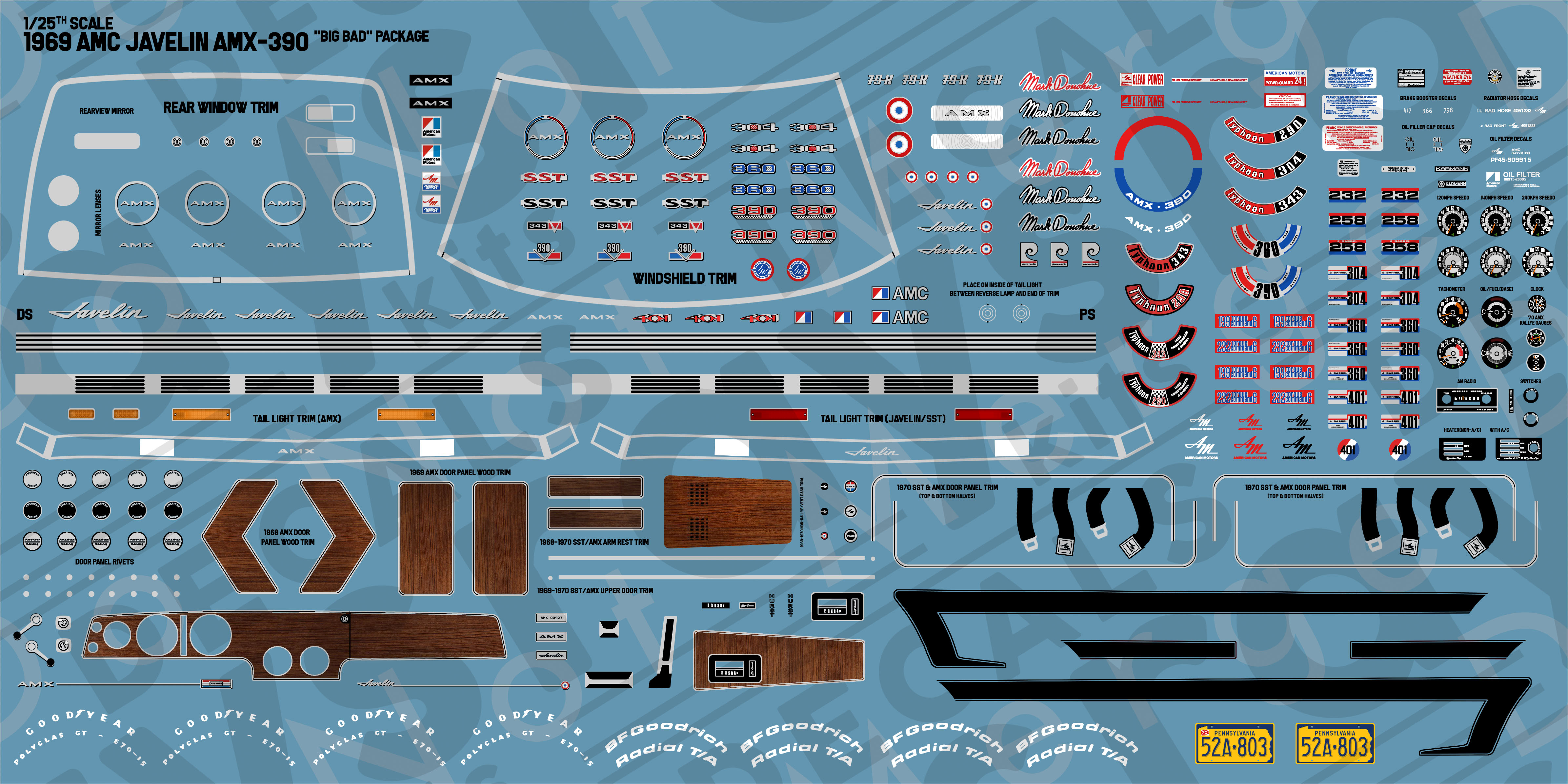 The single most complete set done for the AMC Javelin SST-390 with the Big Bad option striping, made for the 3D print kit available from DioLex Productions, designed by Andrey Bezrodny. The set carries every single detail one could wish from, from exterior trim and every type of emblem imaginable(including 79-K Karmann emblems), through exhaustive underhood decals for every engine type and every single piece of trim, every gauge, you name it, for the 1968, 1969 and 1970 model years.